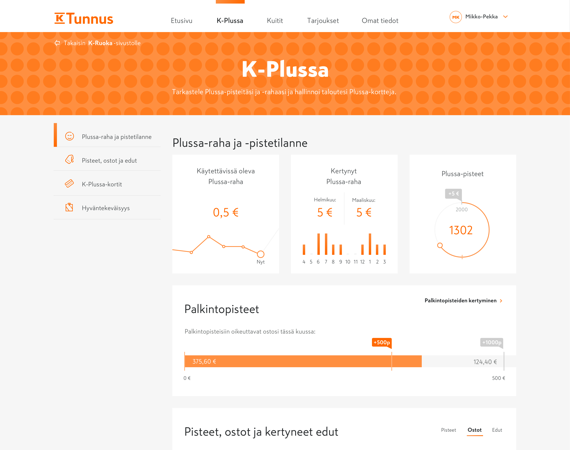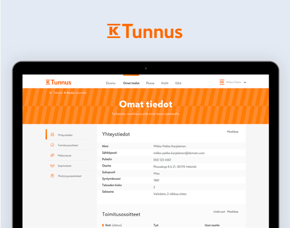 K-Tunnus is a tool for all Kesko's B2C and B2B customers' to authenticate themselves, and to manage and view their personal and/or company customer information in all Kesko's online channels. K-Tunnus puts the user to the center, and brings together all Kesko's websites, Plussa.com and data protection portal. K-Tunnus consists of 2 visible parts: The widget and the website. The service concept is supposed to be implemented piece by piece, and some key parts of the concept are still to be published.