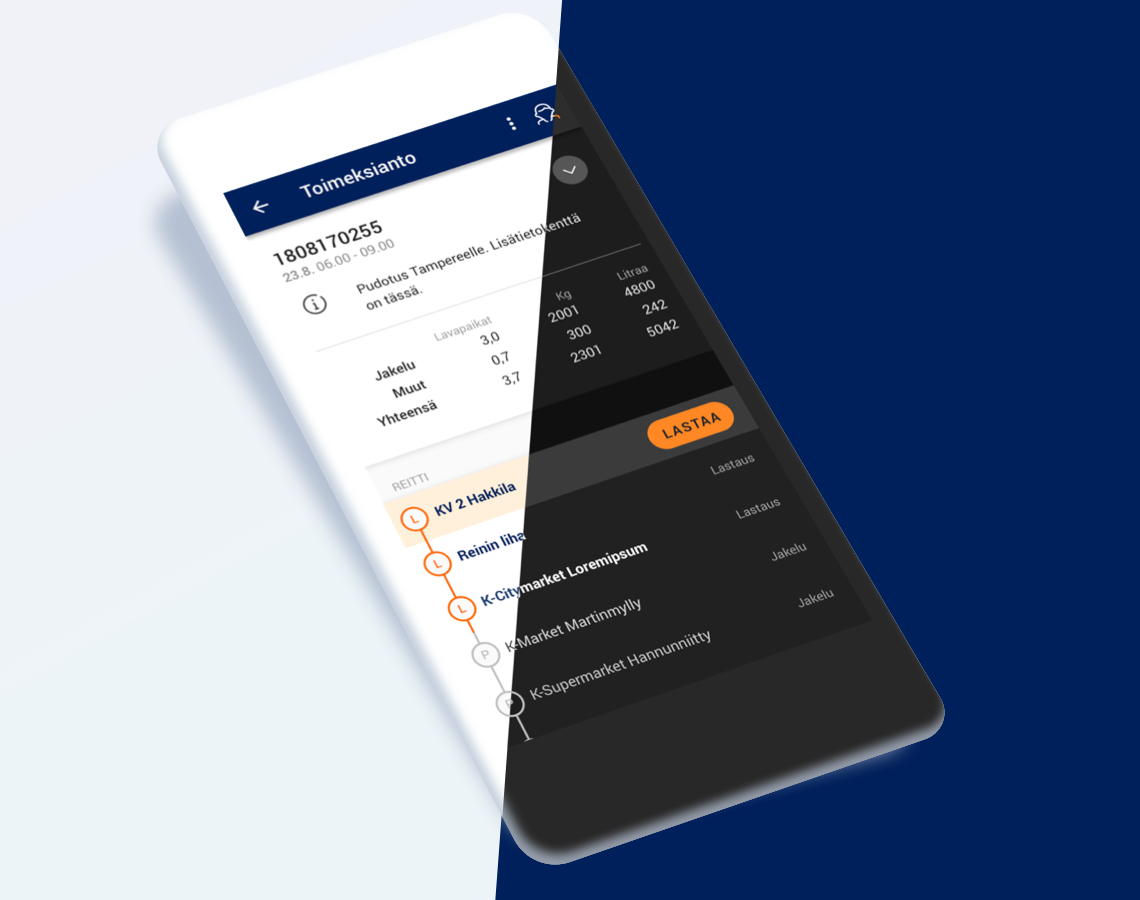 K-Apuri mobile app is used for reporting and keeping all parties up-to-date on assignments and logistics data. The app is used by truck drivers and terminal workers of Kesko Logistics in varied challenging conditions - night and day, inside and outside, in cold and hot circumstances.