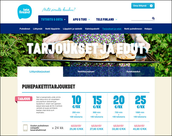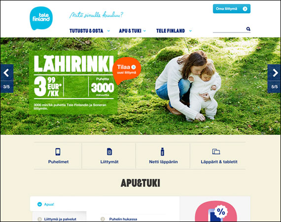 During 2010-2012 I redesigned most of Tele Finland’s web presence in separate projects, including their product pages, e-Commerce functionalities and workflows, customers’ own account and Customer support. Although the site naturally changed a bit through years, the basis such as purchasing funnel and structure of the site remained on our groundwork until March 2017, when Tele Finland and Sonera brands were merged into one Telia brand.